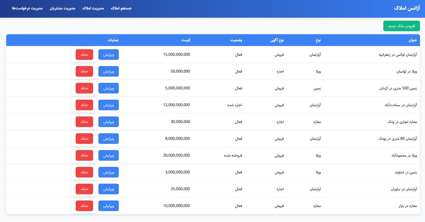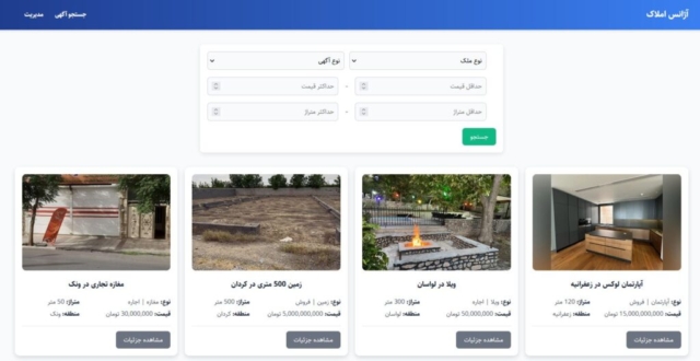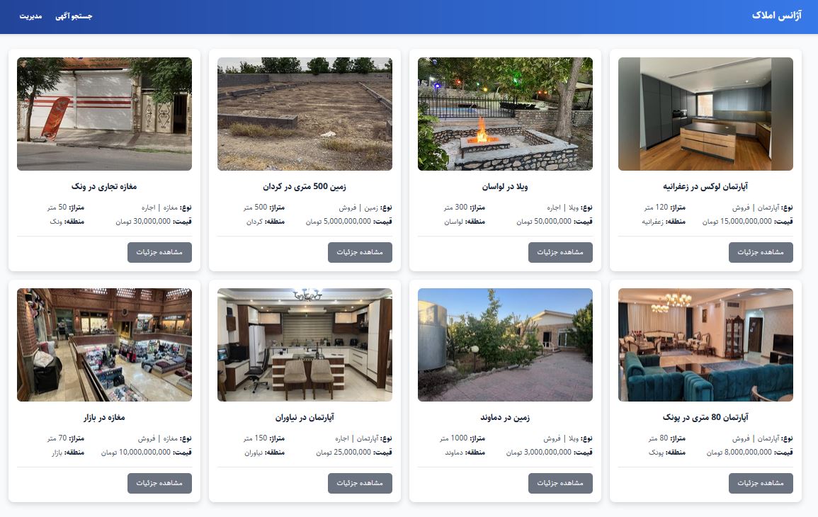 مشاهده لیست کامل املاک با جزئیاتی مثل قیمت، نوع ملک، موقعیت مکانی، متراژ، تصاویر و …