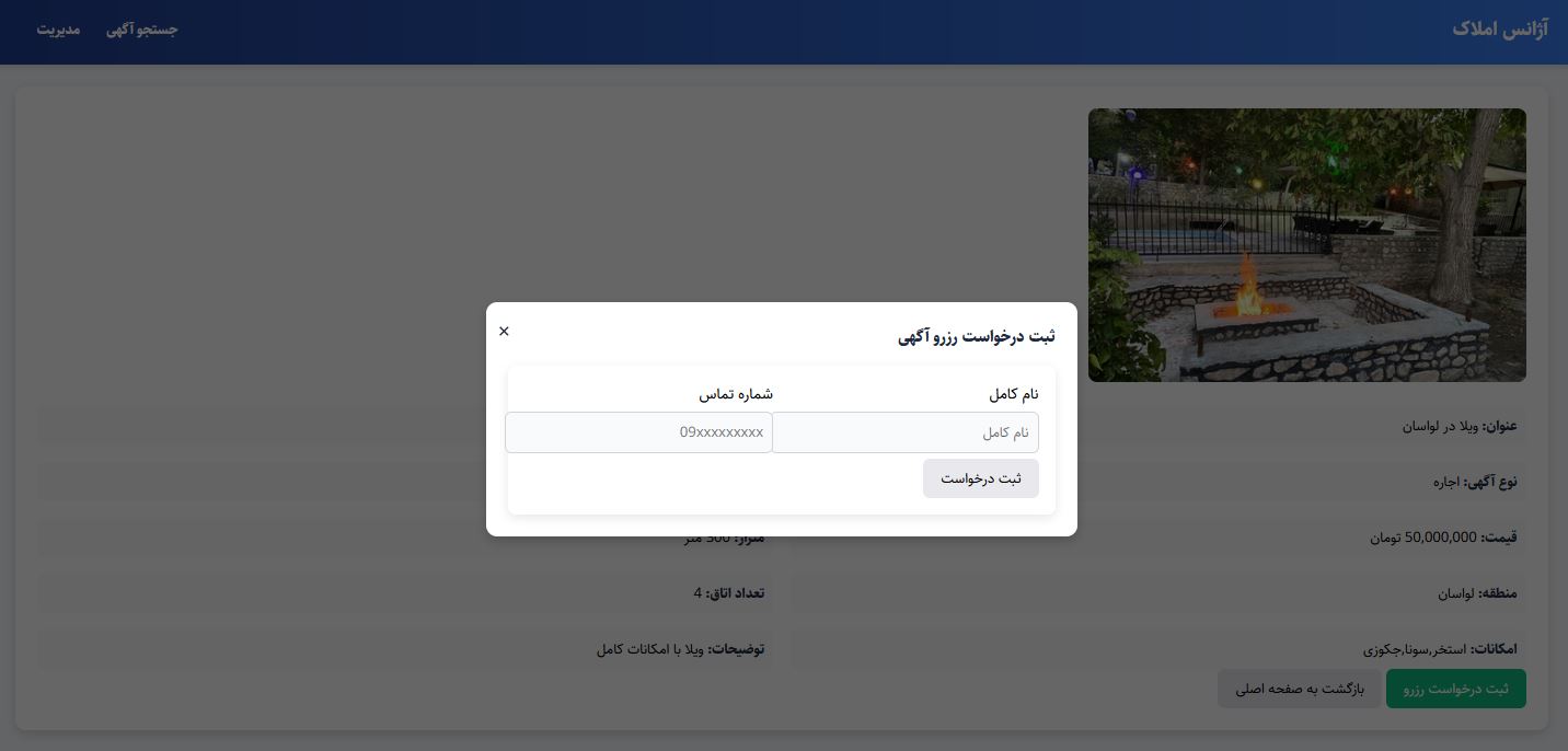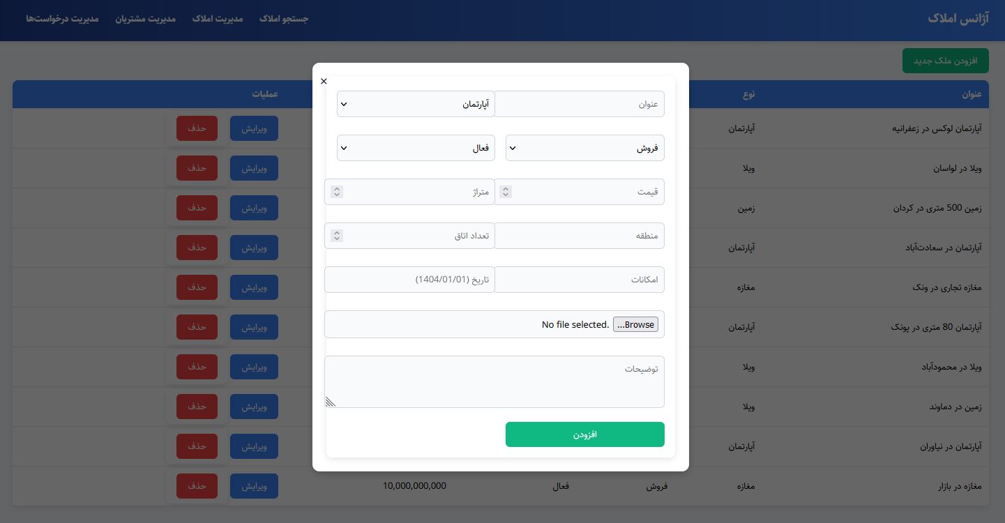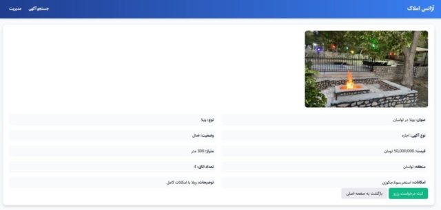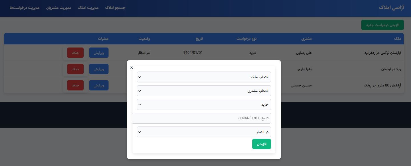 کاربران پس از مشاهده هر ملک می‌توانند به سادگی درخواست خود را برای خرید، رهن یا اجاره همان ملک ثبت نمایند. این اطلاعات در پنل مدیریت قابل مشاهده و بررسی خواهد بود.