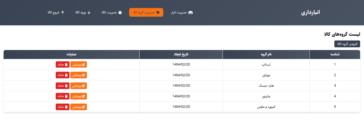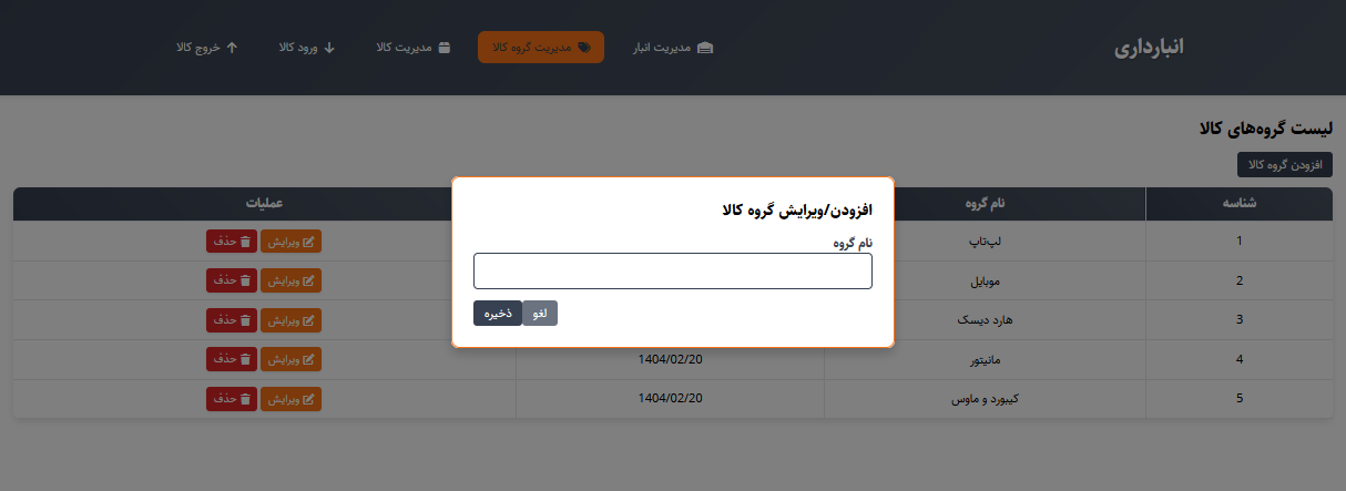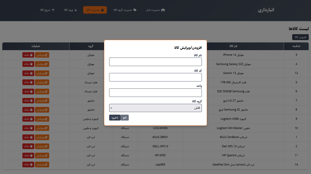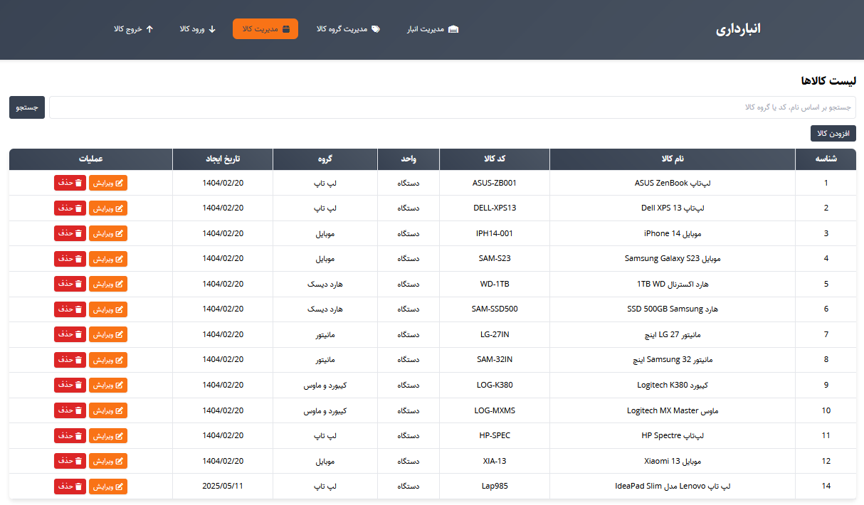 - جستجوی پیشرفته بر اساس نام، کد، یا گروه کالا