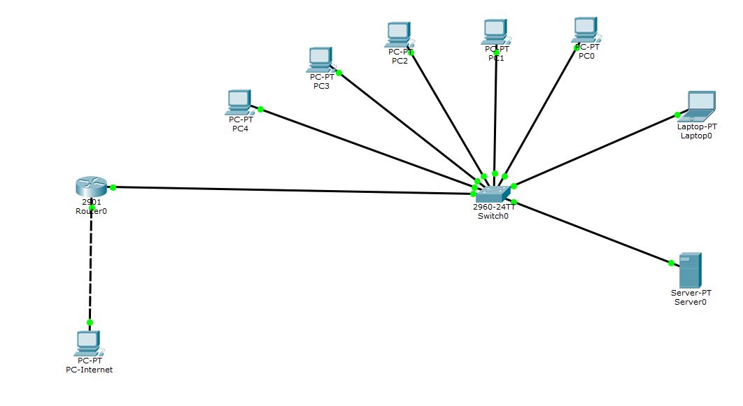 - دستگاهها: – ۱ عدد روتر (1841 یا 2901) – ۱ عدد سوئیچ – ۱ عدد سرور (DHCP + DNS + HTTP) – ۵ عدد کامپیوتر کلاینت + ۱ لپتاپ مدیر – ۱ عدد PC برای شبیهسازی اینترنت