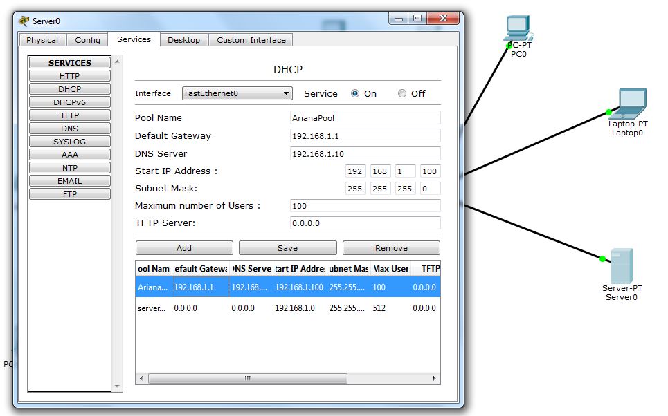 | Server-PT | FastEthernet0 | 192.168.1.10 | 255.255.255.0 | 192.168.1.1 |