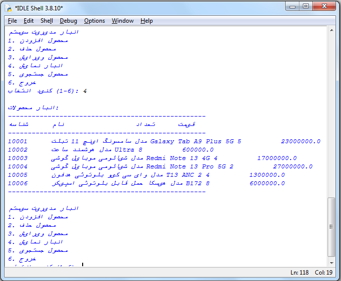 پس از اجرای برنامه، منوی متنی نمایش داده میشود که کاربران میتوانند گزینههای موردنظر خود را انتخاب کنند. اطلاعات بهصورت خودکار در فایل warehouse_data.json ذخیره شده و در هر زمان قابل بازیابی است.