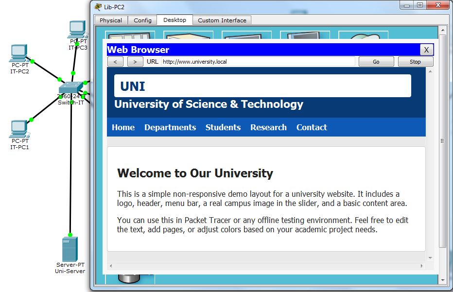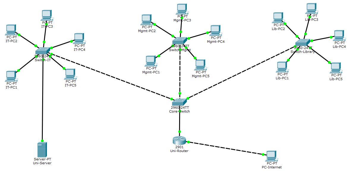 پروژه پکت تریسر شبکه دانشگاه یک پروژه واقعی و استاندارد با سه بخش مجزا (دانشکده مهندسی کامپیوتر، ساختمان مدیریت و کتابخانه) است که با استفاده از Cisco Packet Tracer طراحی و بهطور کامل تست شده است. این پروژه با حداقل تعداد دستگاه (تنها ۲۲ دستگاه) و با رعایت اصول مهندسی شبکه، تمام مباحث کلیدی درس شبکههای کامپیوتری از جمله DHCP، DNS، NAT، Static NAT و مدیریت از راه دور را بهصورت عملی پوشش میدهد.