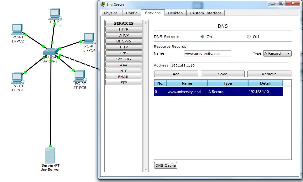 - سرور (Server-PT) → نام پیشنهادی: Uni-Server → IP ثابت: 192.168.1.10/24 → Gateway: 192.168.1.1 → با کابل Copper Straight-Through به Main-Switch (مثلاً پورت Fa0/1) وصل شود